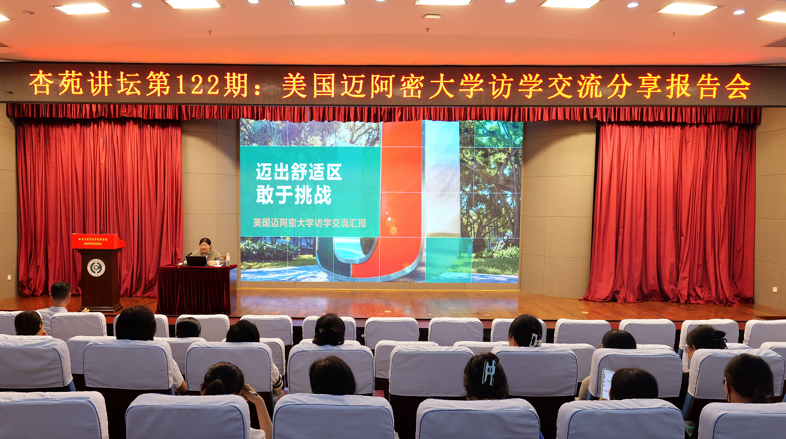 7月3日下午,学校在仁和楼学术报告厅举办了第122期杏苑讲坛:国外访学交流分享报告会,邀请我校美国迈阿密大学访问学者王雪副教授,作了题为《迈出舒适区敢于挑战——美国迈阿密大学访学交流》的分享汇报。学校近300名专兼职教师参加,报告会由教务处教师教学发展中心科长郇玉龙主持。